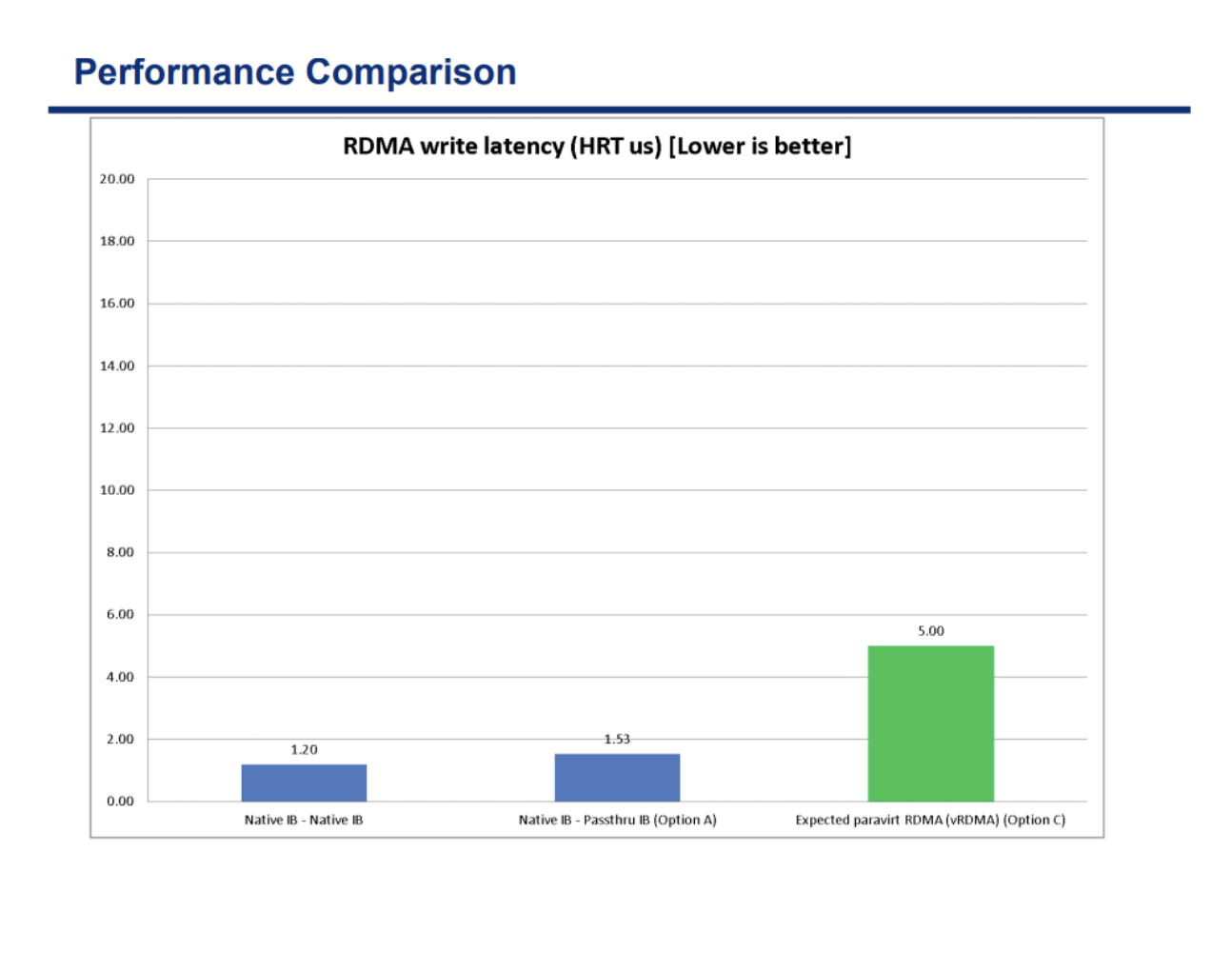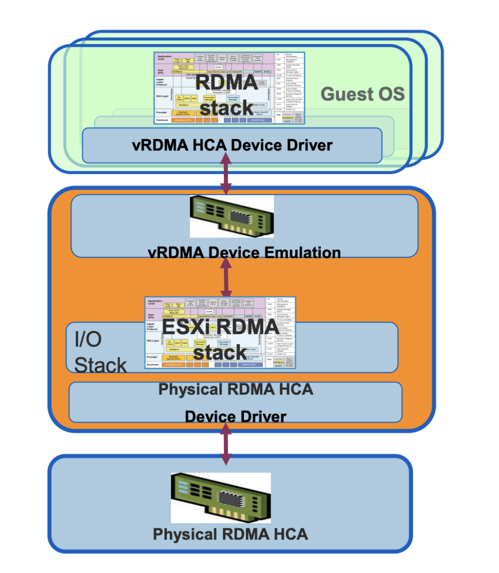 vRDMA 是 vSphere 提供的一种软件模拟 RDMA 的方式,但是他的性能受到很大影响,我们使用 RDMA 就是为了提高性能,所以这种就不会考虑了。 具体性能对比如下: